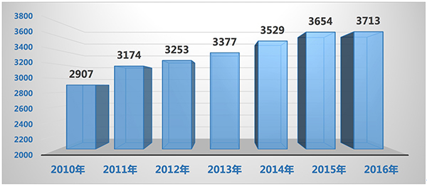 2010年至2016年上海港集装箱吞吐量数据(单位:万标准箱)