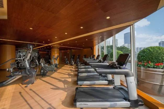 Chi Spa相邻的是健身中心,运动过后,器械间散发着荷尔蒙。标准室内泳池池水清澈,映衬着蓝白相间的瓷砖,任凭外面再寒冷,也要扎进恒温池水的怀抱。泳池深1.2-2.4米,堪称资深游泳爱好者的天堂。更衣室设有温泉池、桑拿房,一泡一蒸,轻盈间跟身体说晚安。