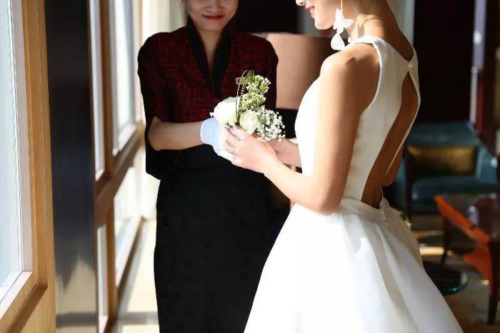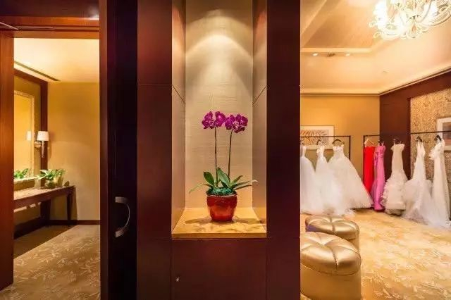 将面积近2100平方米层高约9米的无柱式大宴会厅布满鲜花纱幔,大气典雅,全城也再难找到这般华贵的场地与之媲美。化妆间灯光打在婚纱长长拖尾上,衣美人更美。
