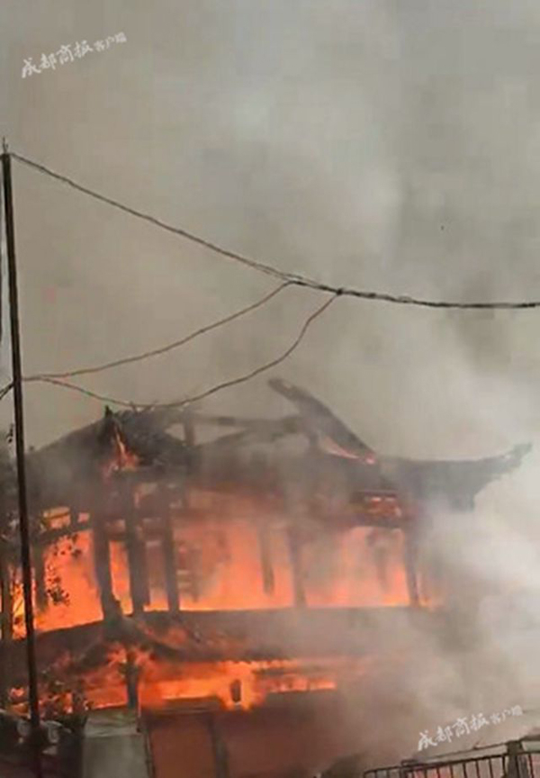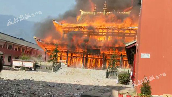 四川绵竹九龙镇灵官楼突发大火,官方称暂无人员伤亡