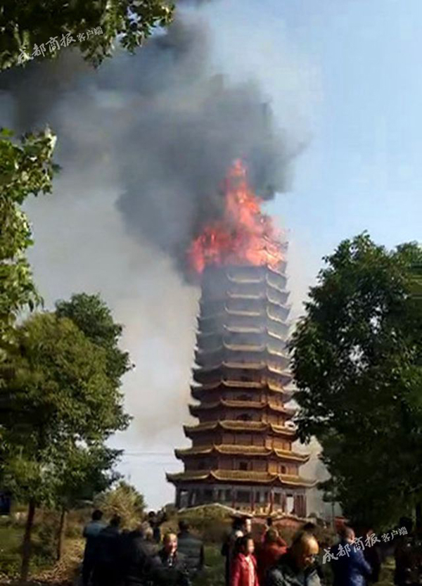 网友提供的一段视频显示,寺庙塔式建筑已经燃起熊熊大火,伴有黑烟四起。上述工作人员说,起火地点是一在建的寺庙,视频中着火的塔是最近几年新建的16层木塔,有着亚洲第一高木塔之称,该木塔已被烧塌。