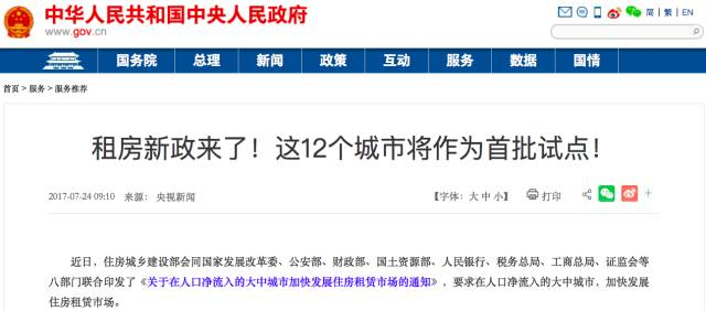 今年7月,住房城乡建设部会同八部门联合印发了《关于在人口净流入的大中城市加快发展住房租赁市场的通知》,要求加快发展住房租赁市场。并选取了广州、深圳、南京、杭州、厦门、武汉、成都、沈阳、合肥、郑州、佛山、肇庆等12个城市作为首批开展住房租赁试点的单位。