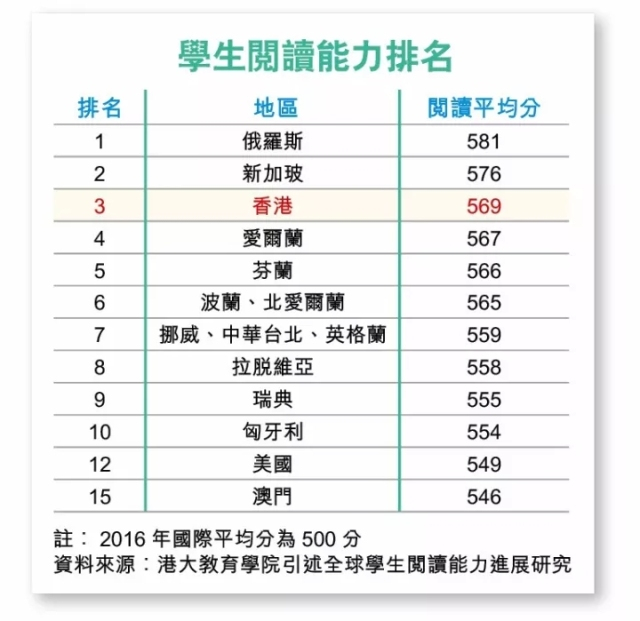 近日,“国际阅读素养进展研究”(PIRLS)发布2016年度研究结果,俄罗斯、新加坡分居第1位、第2位,而中国香港排名由上次研究(2011年)的第1位跌至第3。