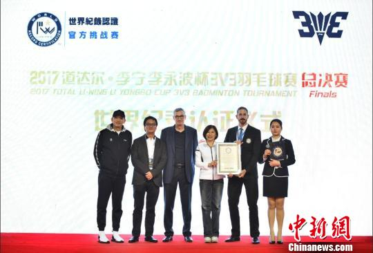 中新网北京12月10日电 2017道达尔·李宁李永波杯3V3羽毛球赛总决赛在北京李宁中心落幕。经过世界纪录认证机构(WRCA)的现场认证,为期四天的赛事中,李宁3v3共迎来了9935人次参赛,刷新了最大规模羽毛球赛事世界纪录。