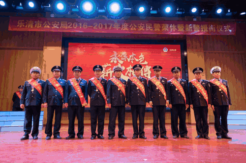 浙江省温州市公安局副局长、乐清市委常委、公安局长蒋荣国为退休民警代表颁授“荣休纪念章”,为新警代表授衔。11名退休民警代表、30名荣誉奖章获得者受到表彰。