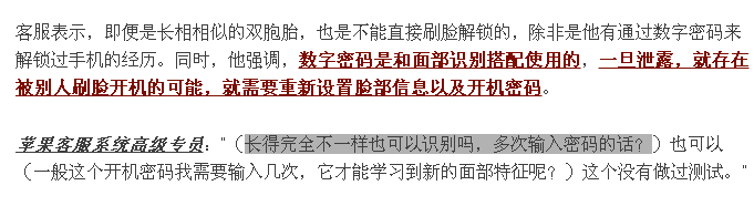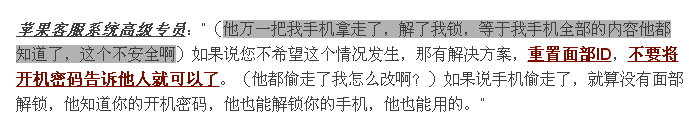 苹果客服系统高级专员:“我跟你说一下,您这个问题我其实有接到用户反映过,因为您家人在拿您手机的时候,面部识别解锁第一次肯定会失败,它就会通过数字密码,就是您锁屏密码,输入密码后就能解锁,她在通过数字密码解锁的时候,这个苹果手机会自动记录下他的面部信息,这个是苹果手机学习的过程。他再拿着这个手机的时候,就可能通过面部识别直接解锁。”