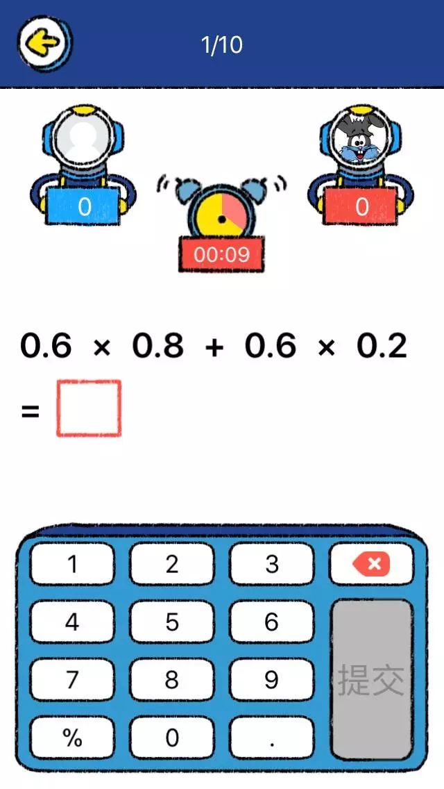 记者尝试“高手区”,APP提示“竞技包含10题,每题限时15秒,越快答对得分越高”。再次进入确认参与,APP自动为记者分配了一名“PK”对手,显示为“育新小学”的一名学生,该学生当前的排名为“2212名”,已获得了“170”个竞技分。开始“PK”,APP随即出了一则包含小数的加减乘法四则运算,中间则开始15秒的倒计时,下方则提示记者赶紧输入答案。