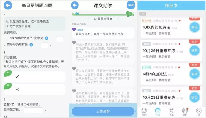如图所示,语文答题和朗诵都可以在软件中完成,但有家长认为缺少了书写和理解过程,语文的教学意义丧失;软件上动画设计后的数学题型被不少家长认为是一种不错的形式。