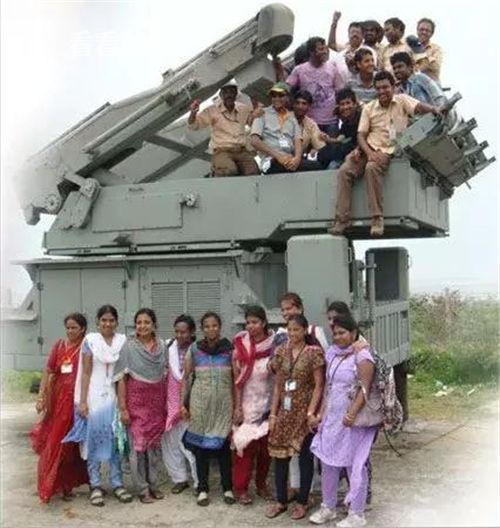 印度科研人员与“阿卡什”导弹发射装置合影。