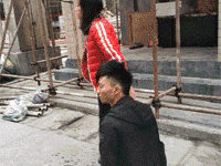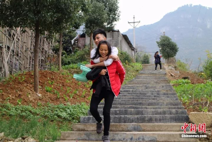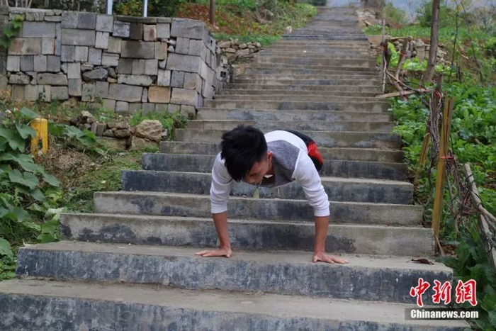 出院后的杜伟借助凳子“行走”,但在一些陡峭的路段,石晓蓉还是会背起自己的丈夫。
