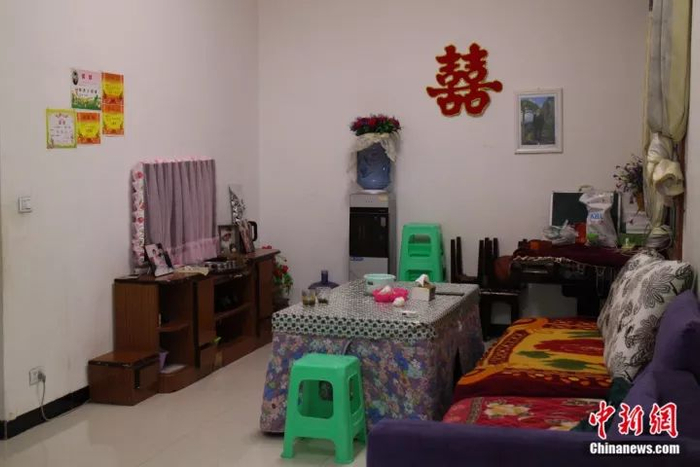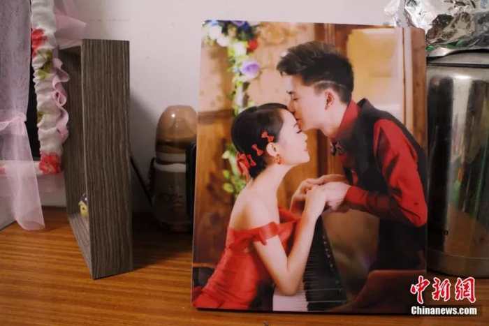 两人的小天地简洁干净,墙上还挂着两人的结婚照,照片中的石晓蓉笑容甜蜜。