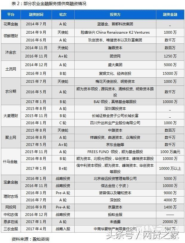 2016年初国务院印发《推进普惠金融发展规划(2016-2020)》,提出“发挥网络借贷平台融资便捷、对象广泛的特点,引导其缓解小微企业、农户和各类低收入人群的融资难问题”。2016年中央一号文件提出,引导互联网金融、移动金融在农村规范发展。2017年初中央一号文件提出,鼓励金融机构积极利用互联网技术,为农业经营主体提供小额存贷款、支付结算和保险等金融服务。十九大报告也持续关注三农问题,提出实施乡村振兴战略。在政策的加持下,电商、互联网金融企业、三农服务商等具备互联网创新精神的互金企业正加速渗透农业金融领域。