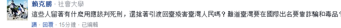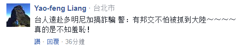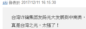 对于台湾诈骗集团跑到美洲行骗,有台湾网友留言讽刺,“台湾诈骗集团发扬光大到中南美,真是台湾之光,太强了!”、“到处发光”,还有台湾网友批评,“真的是不知羞耻”、“很丢脸”、“因为现在是民进党诈骗集团统治”,也有台湾网友称,“送去大陆才是伸张正义”。