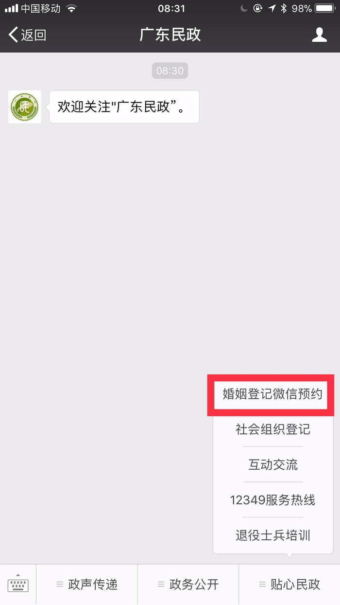 今日起,广东省婚姻登记微信预约正式开通。公众可通过搜索微信公众号“广东民政”,点击关注后进入公众号,在“贴心民政”栏目,选择“婚姻登记微信预约”,即可进行预约。