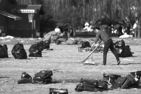 12月11日,橘子洲沙滩公园,草坪上仍有很多垃圾,工作人员正在清理(左图)。组图/记者华剑