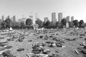 12月11日下午3点,记者来到橘子洲景区沙滩公园,公园靠北一侧的草坪被一条红毯分成两部分,一部分相对干净,但堆了几十个黑色大塑料袋,里面装满了纸袋,另一部分草坪则遍布纸袋和宣传单,其中还夹杂着一些食品垃圾袋和果皮。