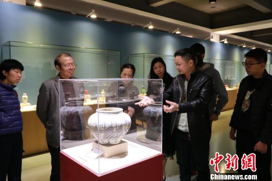 观众听藏家黄祖猛介绍“元·青花百花亭人物故事纹大罐”。 牛效礼 摄