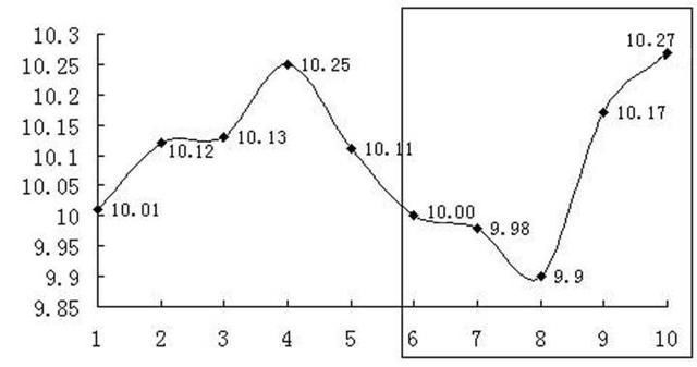 第九天的收盘价为10.17元,用同样的方法将第九天的收盘价、第八天的收盘价、第七天的收盘价、第六天的收盘价、第五天的收盘价相加,总和再除以5,就是第九天的5日均值。