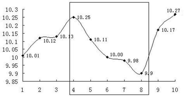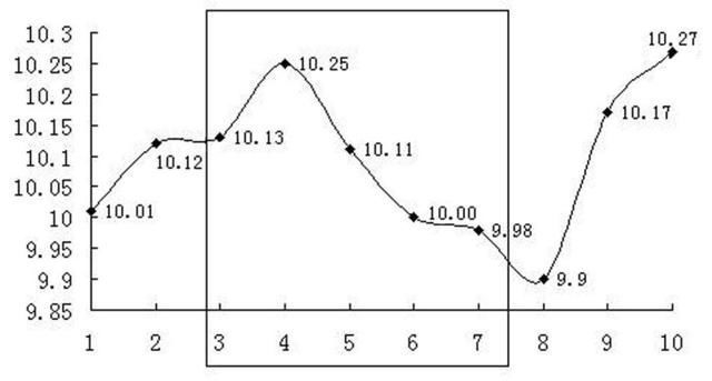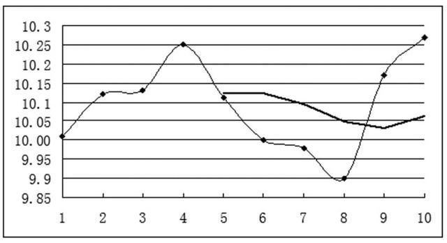 即:(10.25+10.11+10.00+9.98+9.90)÷5=10.048(如图1-4)