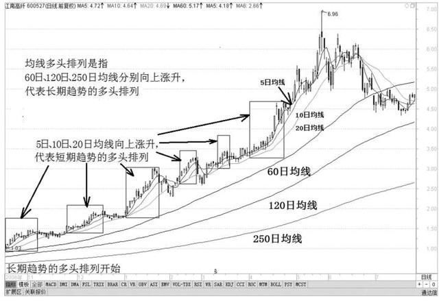 长期趋势的多头排列是指60日、120日、250日均线不断上升,且60日均线在120日均线之上,120日均线又在250日均线之上。它预示了中长线投资者已入驻或股票基本面得到好转而都看好后市,长线获利的机会也相应增加。