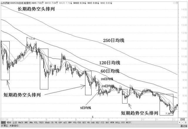 长期趋势的空头排列是指60日、120日、250日均线不断下跌,且60日均线在120日均线之下,120日均线又在250日均线之下。这代表了长期下跌的巨大风险,提示中长期的投资者已经出局,股票已经失去上涨动力,促使中小投资者相继低价卖出手中的股票,所以这种均线形态预示着后市不容乐观。