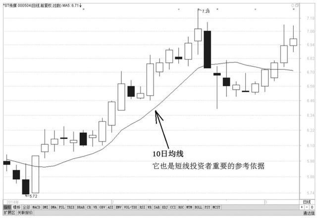 10日均线是指当天价格和最近9天价格的平均,所体现的是最近10个交易日的平均价位,因此它的波动也较大、也较敏感,通常是短线投资者必用的参考线之一。相对于5日均线,10日均线的稳定性更高些。(如图1-9)
