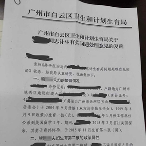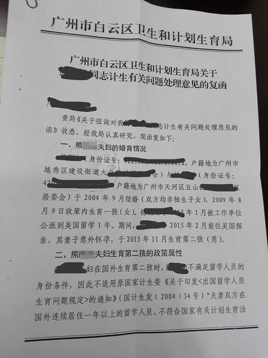 熊先生告诉澎湃新闻,其所在单位商议后,发函询广州市卫生和计划生育委员会(以下简称市卫计委)意见。他提供的资料显示,2017年1月,市卫计委首次回函,将熊先生生育二孩定性为“违反法律”。熊先生不服此定性,提出申诉,2017年9月,广州市卫计委发出第二份函,将熊先生夫妇生育二孩行为定性为“政策外生育”。