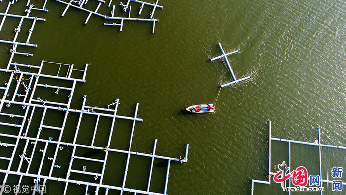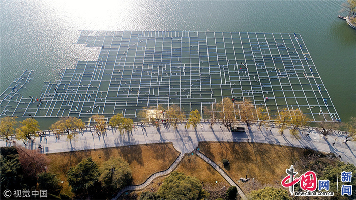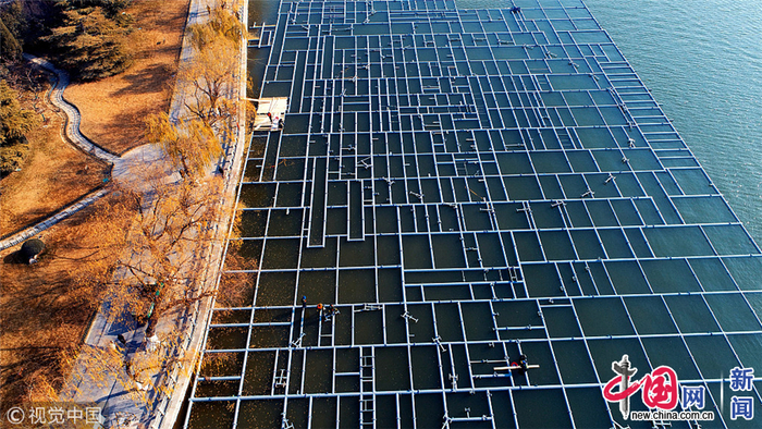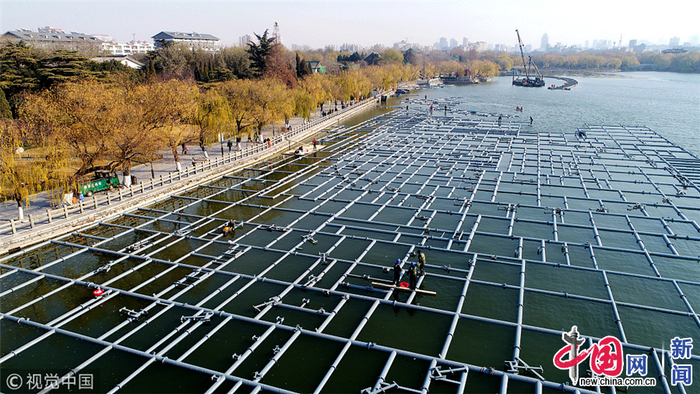 12月11日,山东省济南市,在大明湖北门附近水域,施工人员乘坐小船将一组组由铁管组成的浮台拖至湖中,组装成一处长约150米的巨型升降平台,总面积约1万平方米,总重达到几十吨,从高空俯瞰,密密麻麻的管道漂浮在湖面上,如同一块块稻田。据了解,正在建设的是一湖一环亮化工程重的明湖秀项目,漂浮在湖面的平台上将打造一个水下灯阵,平台上安装喷泉设备,依次排列的三组喷泉中央各有一个矩形水幕,组成水秀表演区,通过喷泉、水幕、纱幕投影,配合灯光装饰展现泉水文化。