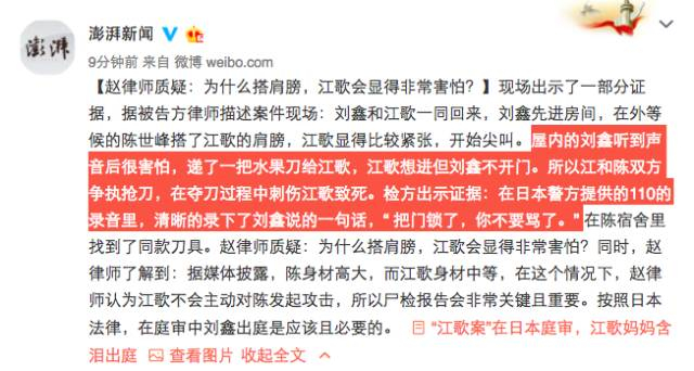 关注丨江歌案庭审细节曝光!刀是刘鑫递出来的,江歌多次按门铃刘鑫没开......