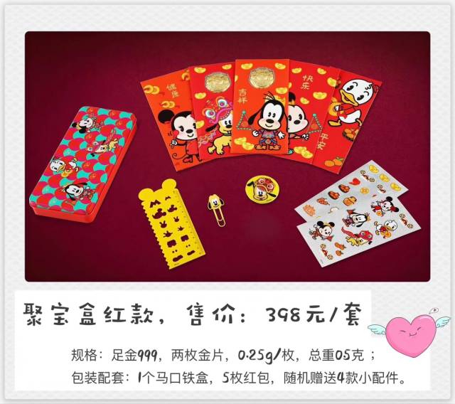 《生肖贺岁金欢乐聚宝盒》创新的红包金镶嵌足金999,立体高浮雕金制聚宝盆,每枚重0.25g。聚宝盆上铸有祥云与“招财进宝”,盆内聚生满满的元宝、铜钱、珍珠和如意,象征吉祥如意、“才”源滚滚、圆圆满满。此款产品精雕细琢、独具匠心、寓意深远,为孩子聚宝聚财聚福气,带给每个家庭最美好的祝福。《生肖贺岁金欢乐聚宝盒》环保包装盒内还汇聚了多种孩子喜爱的实用小配件,随机赠送、惊喜连连。有陪伴孩子安全出行的安全徽章、激发孩子创造力与想象力的趣味绘图板、增加孩子阅读兴趣的书签和增添节庆欢乐氛围的闪闪贴,好看好玩更实用。