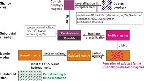 图4.富铜斑岩岩浆的起源与成因框图