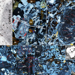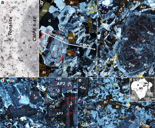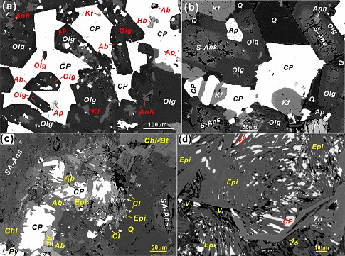 研究人员在中亚斑岩铜矿带新疆东准噶尔琼河坝斑岩铜矿区桑南英云闪长岩中发现富铜斑状基性包体,并开展包体与围岩详细的岩石学、地球化学、年代学、矿石学与成矿作用的研究。结果显示:1、基性包体含有斑状结构、浸染状硫化物和碎裂的堆积斑晶,含有快速结晶形成的细长板状斜长石和针状锆石基质,钾长石、黄铜矿和绿帘石呈交生结构(图1),与主岩有不同的地球化学成分,但与主岩具相似的形成深度和锆石年龄,为富Cu的镁铁质岩浆滴;2、岩石学与岩石化学特征显示,基性包体属于高钾钙碱性闪长质岩浆,形成于正常岛弧背景,而主岩英云闪长岩具埃达克质的特征,可能形成于基性下地壳的部分熔融;3、基性包体多由含磁铁矿的壳和Cu-Fe硫化物核组成,大多数Cu-Fe硫化物呈填隙状分布于基质硅酸盐矿物更长石、钾长石和石英之间,并表现出交生结构(图2a,2b),少量Cu-Fe硫化物分布晶洞中(图2c),并发育黄铜矿-绿帘石的嵌晶结构(图2d),包体记录了斑岩铜矿系统岩浆结晶与流体析出和沉淀的完整过程。研究指出,富铜斑状基性包体岩浆形成于地壳底部岩浆房中的氧化的玄武质岩浆的结晶分异作用(图3)。