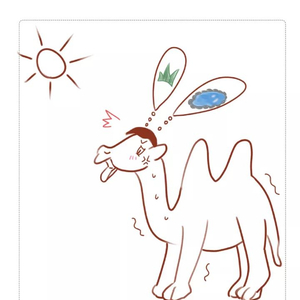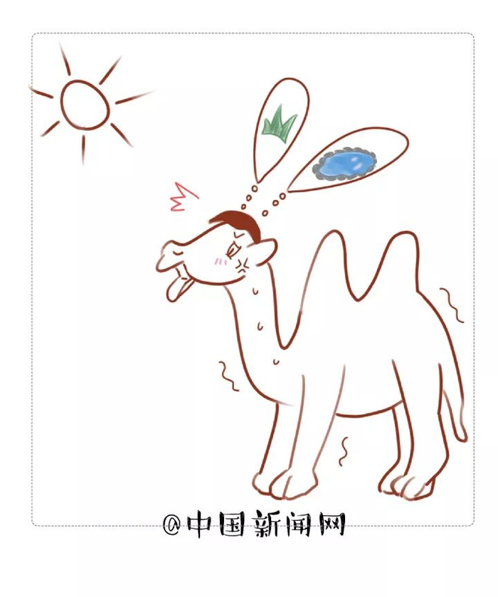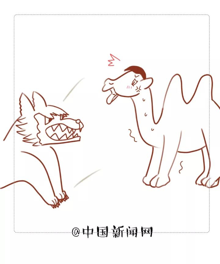 一只骆驼在沙漠里跋涉着。正午的太阳像个火球,晒得它又饥又渴,焦躁万分,一肚子火不知往哪儿撒才好。