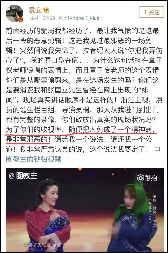 11日上午,袁立又连续发微博继续怒怼浙江卫视《演员的诞生》节目组,称其恶意剪辑: