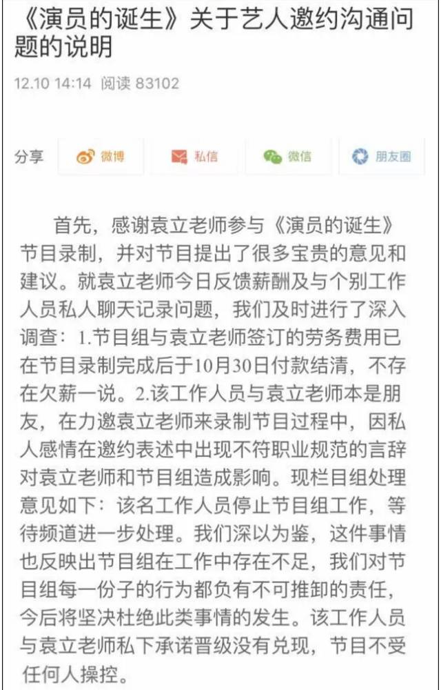 “节目组与袁立老师签订的劳务费用已在节目录制完成后于10月30日付款结清,不存在讨薪的说法。该工作人员与袁立老师本是朋友,在力邀袁立老师来录制节目过程中,因私人感情在邀约表述中出现不符职业规范的言辞,对袁立老师和节目组造成影响。”