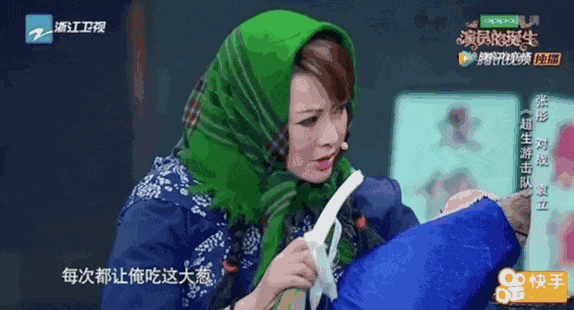 袁立在台上还是很敬业认真的,一口一口吃大葱。