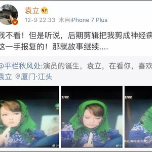 9日晚,《演员的诞生》播出袁立PK张彤演技一集,袁立遗憾被淘汰。当晚,袁立连发数条微博,炮轰节目组,指责节目组乱剪辑,把自己剪成了一个“神经病”。