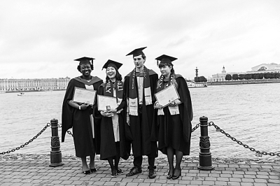 俄罗斯圣彼得堡大学的中国留学生与同学毕业合影。 汪嘉波供图