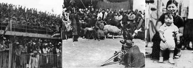 (左)1933年,南京民众在观看第五届全国运动会开幕式。(中)1934年,美国米高梅电影公司在南京拍摄电影《大地》的场景。(右)1935年,一对母女在南京市健康儿童比赛中合影。