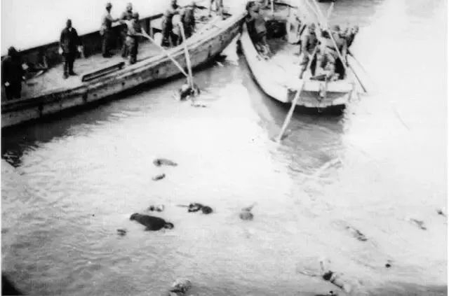 1938 年1 月上旬,日军工兵队在南京下关的长江中,用木棍将浅水处的死难者尸体推入激流,以毁尸灭迹。