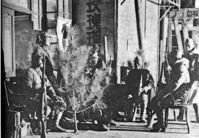 1937年底,日军士兵聚集在圣诞树前过圣诞节。