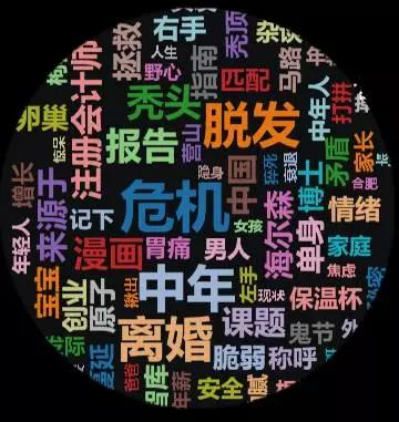 而带有“第一批 90 后”字眼的文章提及最多的便是“中年”“危机”“离婚”“脱发”“秃头”这些词,“胃痛”“保温杯”“情绪”“矛盾”“脆弱”等等也清晰可见。