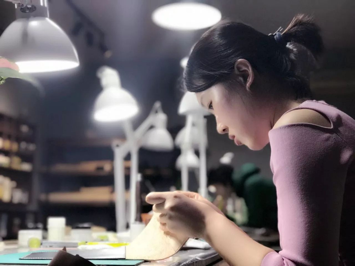 其实,匠人的背后,是每天从早上九点到晚上九点,台灯下不动如钟的一锤一斩一针一线;是挖空心思设计的皮具体验课样版;是雷打不动的皮雕练习摸索;是风险系数和难度系数并存,可能一不留神就会戳伤的手;是酸涩的双眼;是胀痛的肩颈;甚至是为了打造一个流畅的唐草造型而憋涨的膀胱……