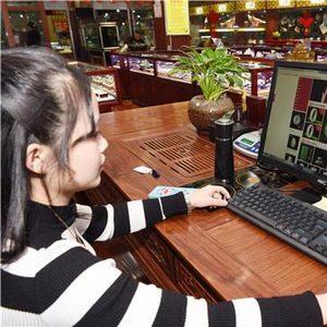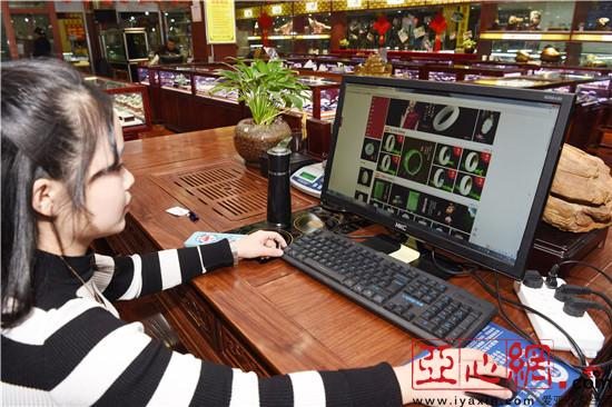 12月12日,在库尔勒市西部白马商城,一家和田玉店铺的工作人员在网上销售玉石。