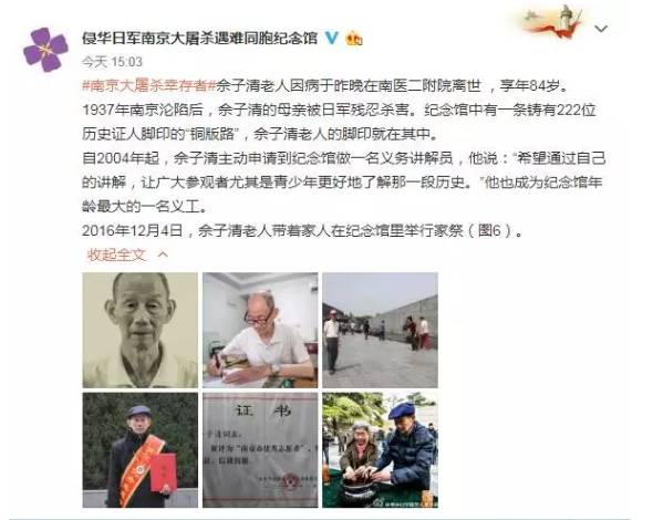 让人悲痛的消息是:这本画册首发前不到一个月,大屠杀幸存者佘子清和杨明贞老人同日离世。