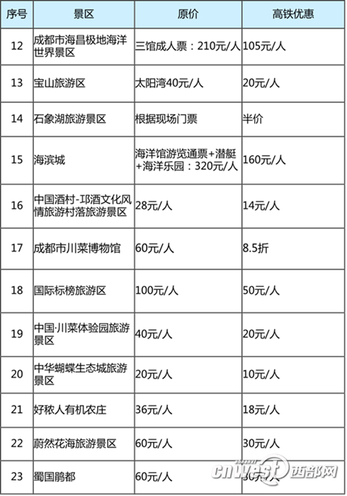 西部网、陕西头条记者在推介会上了解到,成都旅游景区协会针对西成高铁开通,发起了“乐乘高铁、惠游成都”倡议活动。目前,成都市有23家A级景区参加,12月15日—2018年3月期间(部分景区春节或小长假除外),外地游客凭本人身份证和西成高铁票可享受相关优惠。
