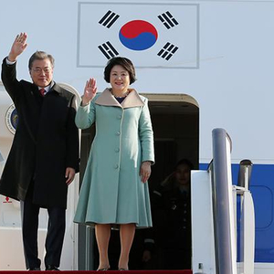 2017年12月13日,北京,韩国总统文在寅乘坐专机从首尔出发,抵达北京首都国际机场。 视觉中国 图