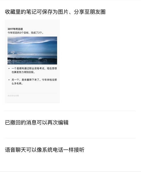 有部分人出现「明明在 App Store 更新了,但微信内显示版本号依然没有变化,也看不到新增功能」的情况。经试验得知,这是设备 iOS 版本没有升到最高的缘故。出现上述情况的话,只要将 iOS 系统升级到最新版本,微信新版本就会立即生效。