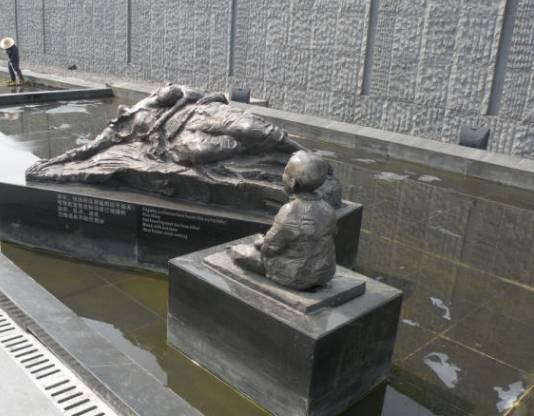 在南京大屠杀纪念馆里,有一尊极其震撼地反映日本侵略者暴行的雕像:母亲倒在地上,挣扎着用最后的力气去给哭叫的小儿喂奶,终于不支死去;而可怜的孩子还浑然不觉,使劲地吮吸母亲的乳汁,在寒冷的冬天里,两人很快被冻结在一起……旁边,还有一个小孩,在无助地痛哭……