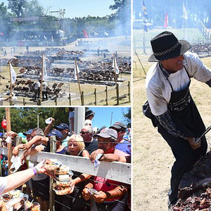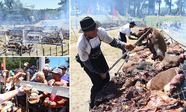 在乌拉圭,超过150家牛排餐厅汇聚一堂,用16吨牛肉打造了一场无与伦比的烤肉盛宴。人们期待能借此打破由阿根廷某小镇保持的世界纪录。现场还提供了近8吨沙拉,为烤肉宴锦上添花。组织者预估该活动将烹制大约3.5万份到3.8万份烤肉。